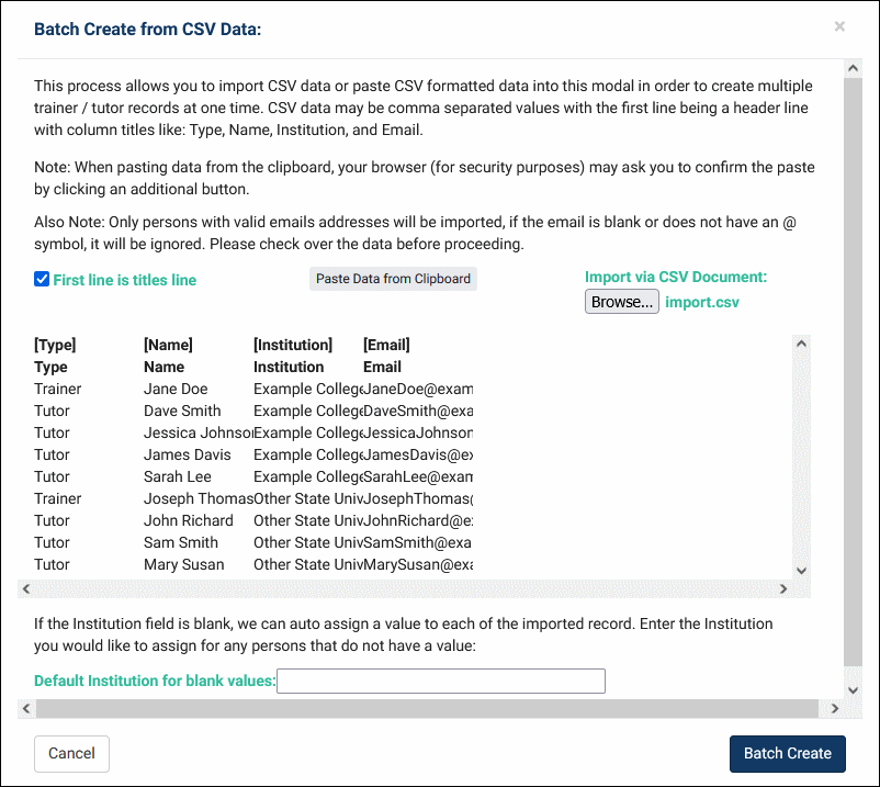 - Batch Create Tutors provides a utility to create many trainer and tutor accounts at once. This requires for columns of data from either a CSV file or uploaded from your clipboard: Type (Trainer or Tutor), Name (First Last), Institution, and Email. If your import data doesn't contain institution, you can enter a Default Institution for blank values prior to batch creating the records.
