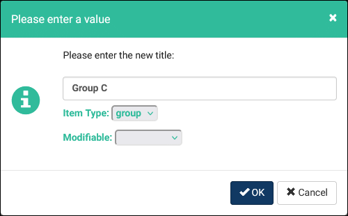 - New groups or topics can be created by clicking the button. This will open a prompt where you can enter the name of the item, the type (Group or Topic), and whether or not it's modifiable. If the item is modifiable, the trainer can click on it to rename the item. Modifiable topics are counted differently than regular topics. If a tutor completes a modifiable topic in a group, then they do not need to complete 1 regular topic in that same group to achieve 100% completion. In other words, a modifiable topic replaces 1 regular topic.
