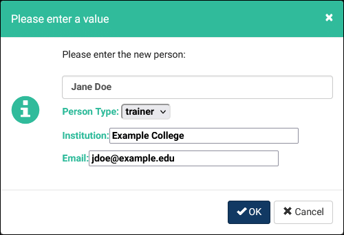 - The list of trainers & tutors can be modified using the buttons in the top-right corner of the view. You can choose to only view one of the two user types, or optionally display each person's email address or institution. New trainers or tutors can be created by clicking the button. This form allows the coordinator to enter their name, type (trainer or tutor), institution, and email address.