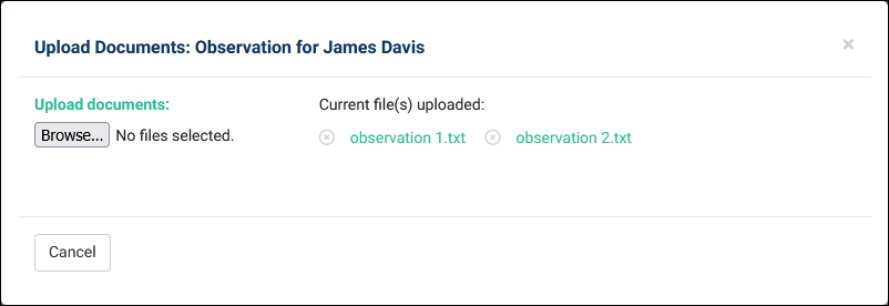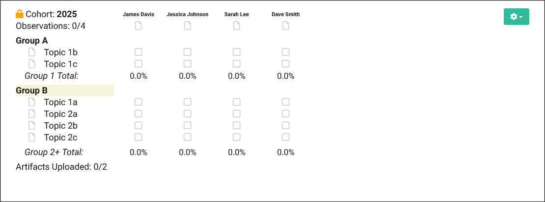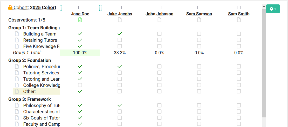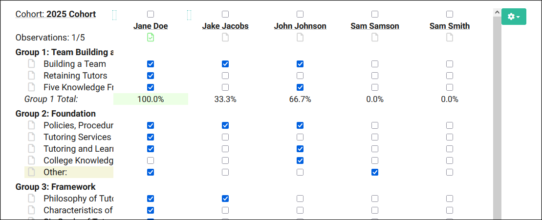 Once stage 2 begins, the trainer can be marking topics as completed for each of the listed tutors. Observations can be uploaded for tutors using the document icon at the top of each column, and artifacts for each group can be uploaded using the document icons along the left side of the screen next to the topic names. For any document location, multiple files can be uploaded.