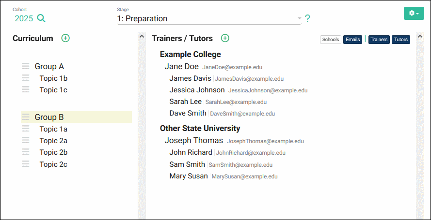 Stage 1 allows Coordinators to prepare the cohort curriculum and create the trainers and tutors associated with this cohort. The curriculum consists of Groups and Topics. During this stage, Trainers can view the curriculum but cannot make changes.