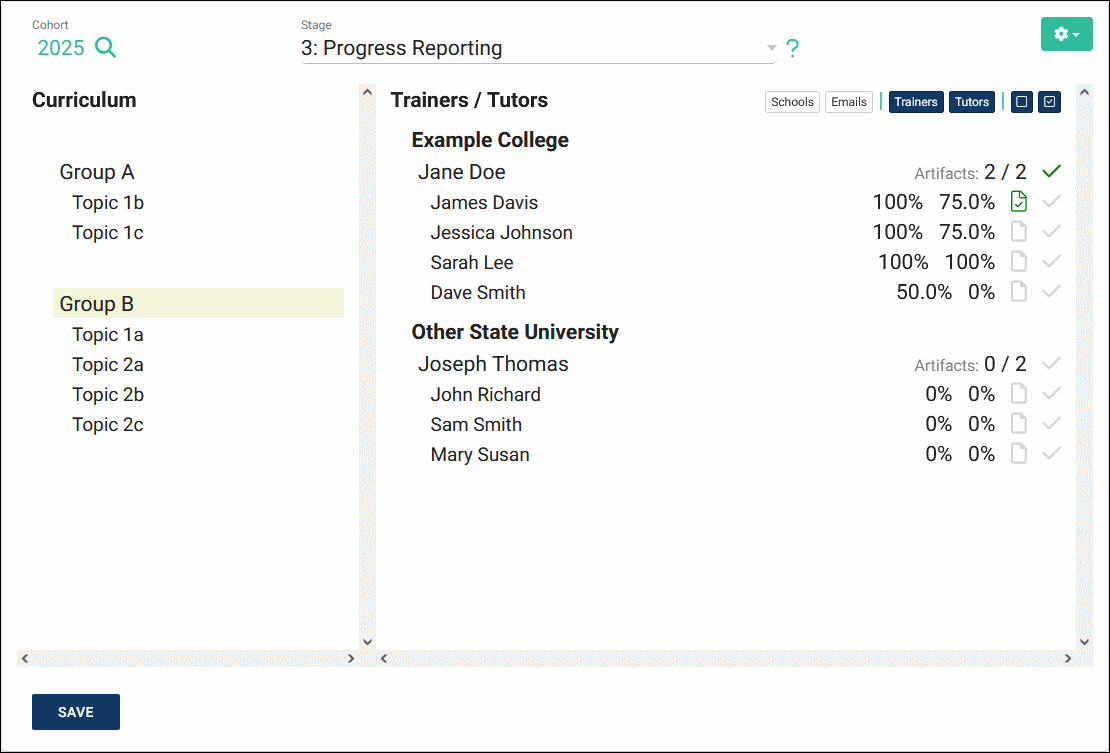 Coordinators gain new columns of data in the Trainers / Tutors list in this stage for progress reviews, but the curriculum can no longer be modified in this stage.