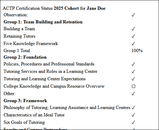 The ACTP Tutor Training Tracker in TracCloud allows coordinators to build curricula, defining groups and topics as well as creating trainer and tutor records. Trainers will then be able to login to TracCloud and upload artifacts to the curriculum groups or observations for the tutors they are assigned to. This article covers what this process looks like from both the coordinator and trainer perspective.