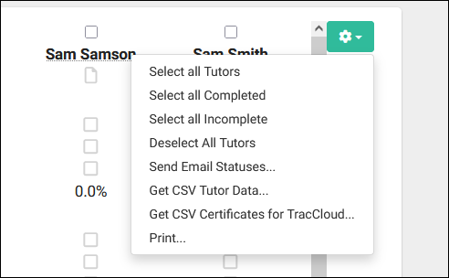 Get CSV Tutor Data allows an export the completion status and percentage for each selected tutor as a CSV. The trainer can also copy this information for an individual tutor by clicking on their name.