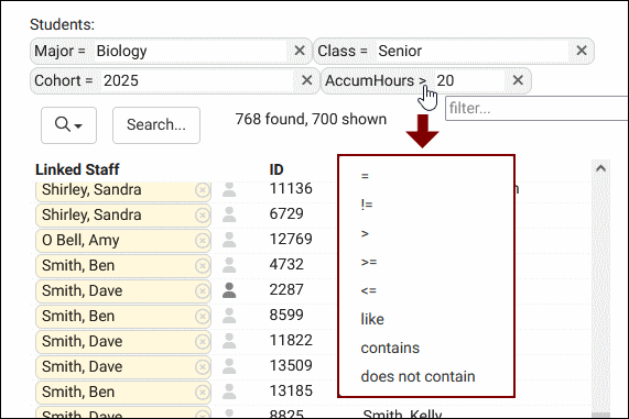 Opening this utility will present you with a list of consultants and students. The button can be used to add search filters to each list. You can add as many filters as needed and you can click on the operator of a search to change it. "%" is the wildcard if performing a "like" search. You can additionally click on consultant or student names to open their respective profiles.