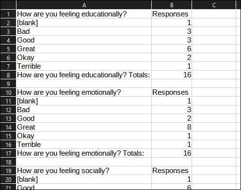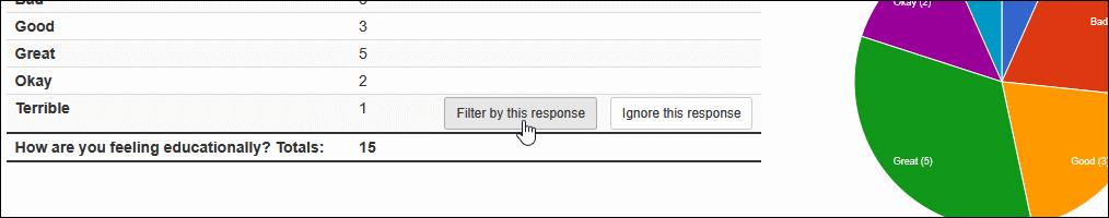 A unique feature of this report is the ability to filter responses from the results screen. Hover over a response and you can choose to either filter to only responses with that answer or to exclude responses with that answer. This applies to all questions in the report, so for example, you could see how students who answers X to Question A responded to question B.