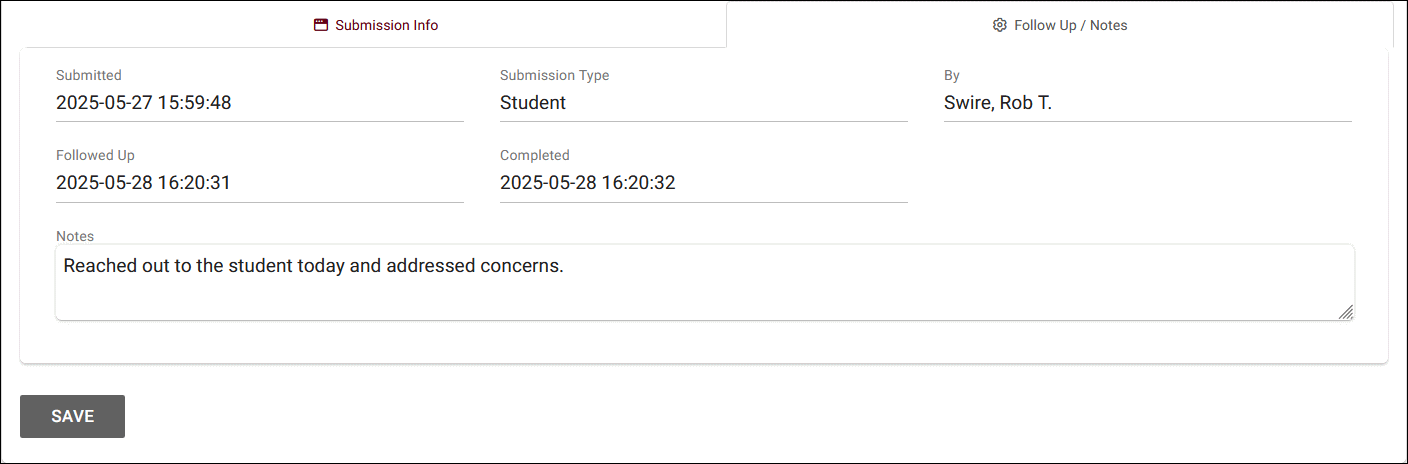 The Submission Info tab will show the original response from the recipient, while the Follow Up / Notes tab will allow you to record when the form was followed up on or completed. A notes field is also provided to record additional information about this response or follow-ups.