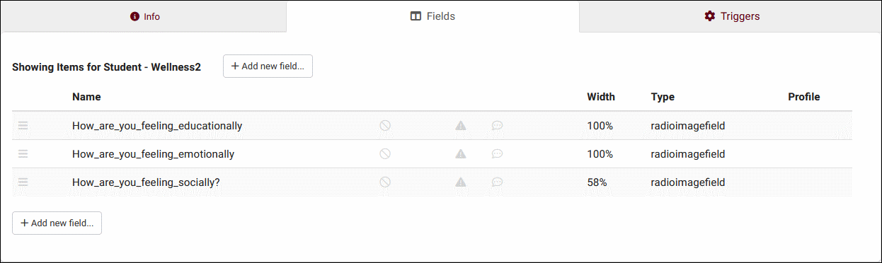 This tab contains all of the questions you're asking on your reflective prompt, wellness check-in, or custom form. This is essentially a shortened version of the custom fields listing, showing only the custom fields assigned to your chosen form. You can add new fields by clicking the "Add new field" button. Information about creating or managing these fields can be found here.
