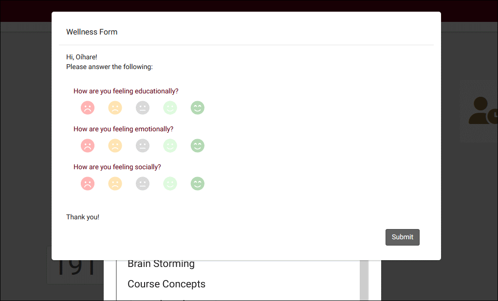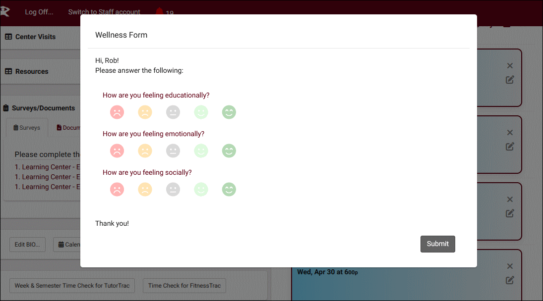 Similarly, if configured to do so, the form can randomly appear during kiosk login prior to the student selecting their subject, reason, etc.