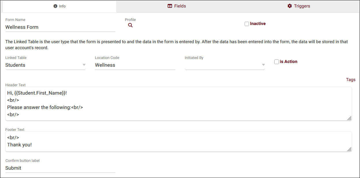 - If enabled, it will be possible to submit this form from a student, staff, or faculty member's account via the "Actions" button at the top of their profile.