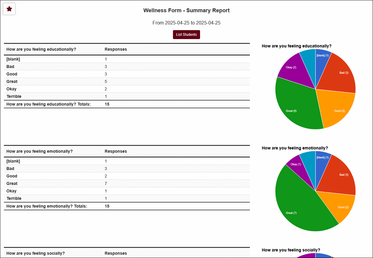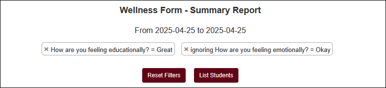 After applying filters, you can scroll up to the top of your report screen to reset your filters or click "List Students" to be taken to the students listing to see which students submitted the responses you're currently viewing.