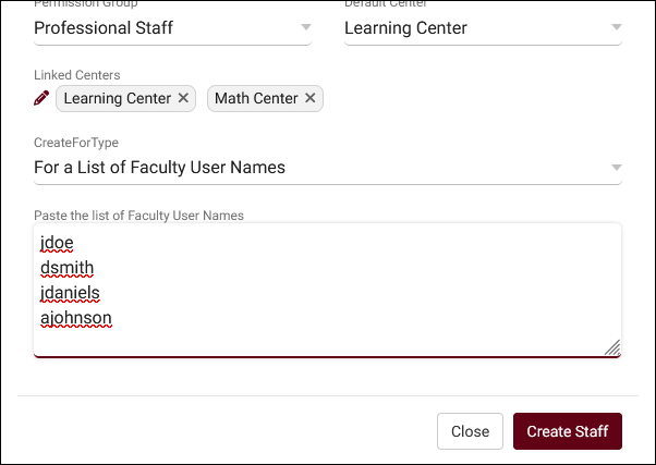 This utility can also be used to batch create staff accounts for multiple faculty at once by changing "CreateForType" to "For a List of Faculty User Names." In this case, you will list out the usernames of all faculty you wish to create staff accounts for. All of them will be assigned to the group and center(s) you select above.