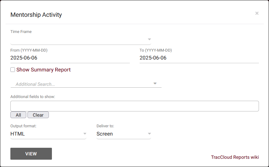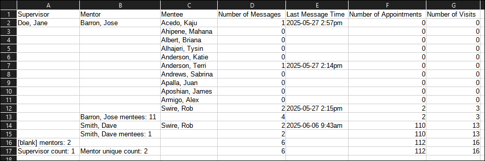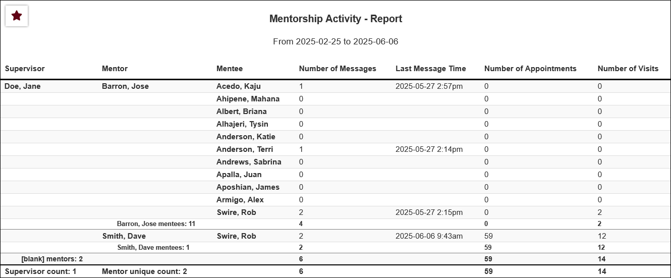 The Mentorship Activity report in the Management category will display mentorships grouped by supervisor, then mentor. For each mentorship, the number of messages, last message time, and the number of appointments & visits with the mentor will be shown.