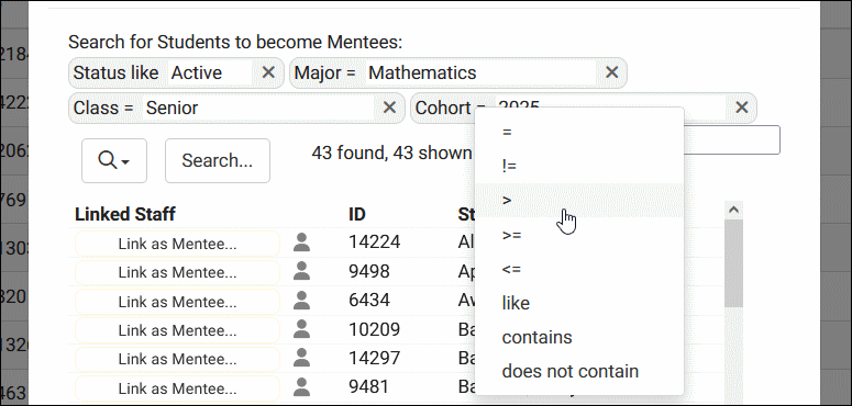 The list of students can be filtered by adding additional search fields using the button. You can add as many filters as needed and you can click on the operator of a search to change it. "%" is the wildcard if performing a "like" search.