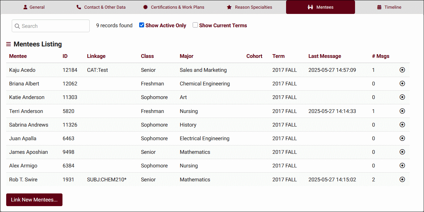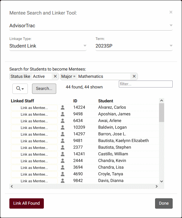 The Link New Mentees utility allows you to assign one or multiple students as mentees for the selected mentor. Linkage type can be used to note the link between mentor and mentee, such as a subject or reason. You can click on student names to open their profile.
