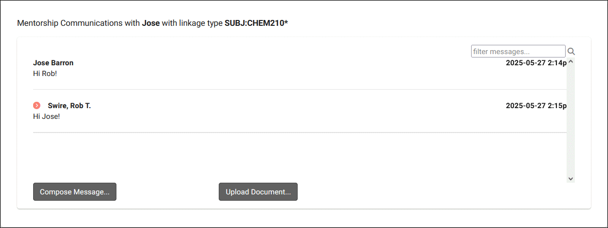 Clicking on the mentorship will open the communications window (unless disabled in system preferences), where the mentee can talk with their mentor. Either party can additionally upload documents to the chat using the "Upload Document" button. SMS & email notifications can optionally be sent to both parties if configured in your profile preferences, under Scheduling -> Other Schedule Options.