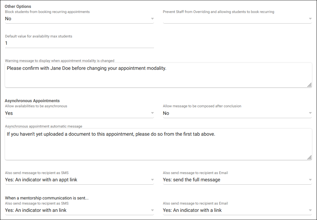 - When a staff member changes the modality (in-person/online/asynchronous) of an existing appointment, a warning message will appear to confirm that they want to make that change. This text field allows you to add an additional custom message to that warning.