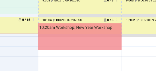 To prevent conflicting appointments if a consultant is linked to a workshop (and that workshop is linked to a center), a reserve block will automatically be placed on their schedule at the workshop time. This will hide overlapping availabilities from search results just like regular reserve blocks.