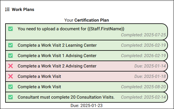 Work Plans allow you to track staff (consultant or advisor) progress on a set of tasks or training steps in custom plans, designed for staff development or projects. The core functionality is similar to the [[TracCloudSuccessPlans|Success Plans module]] for students. Each Work Plan consists of steps that staff must complete – such as completing training sessions, achieving certifications, or fulfilling certain duties. For example, a tutoring center might have a “New Tutor Training Plan” with steps like attending orientation, shadowing a senior tutor, and passing a skills test. TracCloud can chain Work Plans as well, so after “Level 1 Training” the tutor could automatically get a “Level 2 Development Plan” assigned. Supervisors can monitor these plans to ensure staff are progressing in their professional development or assigned projects. | Work Plans allow you to track staff (consultant or advisor) progress on a set of tasks or training steps in custom plans, designed for staff development or projects. The core functionality is similar to the [[TracCloudSuccessPlans|Success Plans module]] for students. Each Work Plan consists of steps that staff must complete – such as completing training sessions, achieving certifications, or fulfilling certain duties. For example, a tutoring center might have a “New Tutor Training Plan” with steps like attending orientation, shadowing a senior tutor, and passing a skills test. TracCloud can chain Work Plans as well, so after “Level 1 Training” the tutor could automatically get a “Level 2 Development Plan” assigned. Supervisors can monitor these plans to ensure staff are progressing in their professional development or assigned projects. | ||